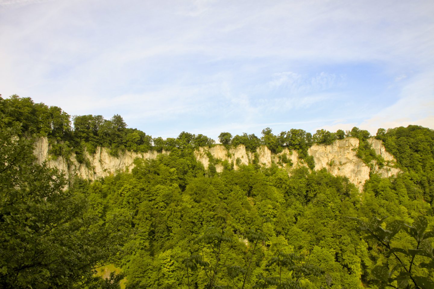 Kurz nach einer mit Eisengeländer gesicherten Stelle erreichen wir die Hochebene und wandern nun an der aussichtsreichen Hangkante entlang, passieren einen Rastplatz mit Aussichtsliegen, später den Gedenkstein von Ernst Camerer, einem Gründungsmitglied und ehem. Vorsitzenden des Schwäbischen Albverein.