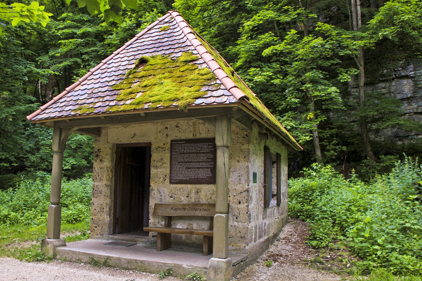 Ein wurzeliger Waldpfad bringt uns steil und kehrenreich hinab, rechtshaltend überschreiten wir den Hangkamm und hören auf der anderen Talseite schon das Wasser rauschen. Nochmals steil bergab gelangen wir zum oberen Ende des Gütersteiner Wasserfalls und zur kleinen Kapelle Güterstein.