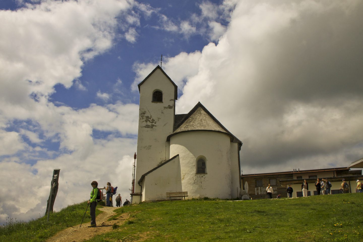 Wir verlassen die Kapelle auf einem schönen Waldpfad, der uns aus dem Wald heraus- und über offenes Almgelände führt. Rechts oben ist (schon ab dem Filzalmsee) die Bergstation gut zu erkennen. Wir folgen der Markierung („Hohe Salve“), gelangen wieder auf einen breiten Kiesweg und haben bald den Scheitelpunkt einer Hochfläche erreicht, direkt beim Salvensee. Von hier ist der sich zum Gipfel hochschlängelnde Anstiegsweg gut einzusehen, der uns sehr sonnig und schweißtreibend in einer guten halben Stunde zur Bergstation, zur Gipfelkirche und zum Bergrestaurant (mit Drehterrasse) auf der Hohen Salve hochbringt.