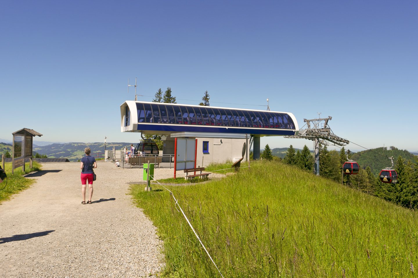 Eine Panoramatafel informiert uns über die Aussicht, besonders eindrucksvoll präsentiert sich der Säntis. Wir gehen dann ein paar Meter auf schmalem Pfad bergab zu einer Wegkreuzung und biegen nach links auf einen kaum erkennbaren Pfad ab, der bald in einen breiteren, leicht abwärts führenden Weg übergeht. Wir treffen auf einen weiteren Weg, der nach rechts hoch ansteigt, eine leicht erhöhte Skistation dient uns als Orientierung.