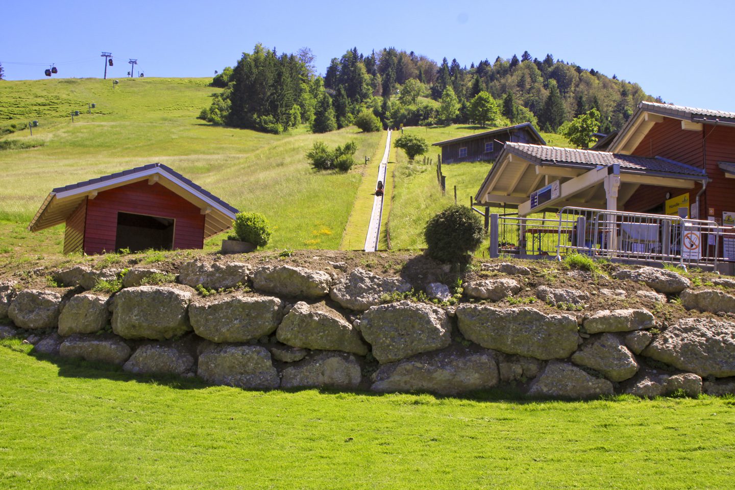 Direkt vor der Bundesstraße treffen wir auf die Hubertusstube, halten uns rechts und wandern entlang der Straße – vorbei an der Rodelbahn – zur Hündlebahn-Talstation.