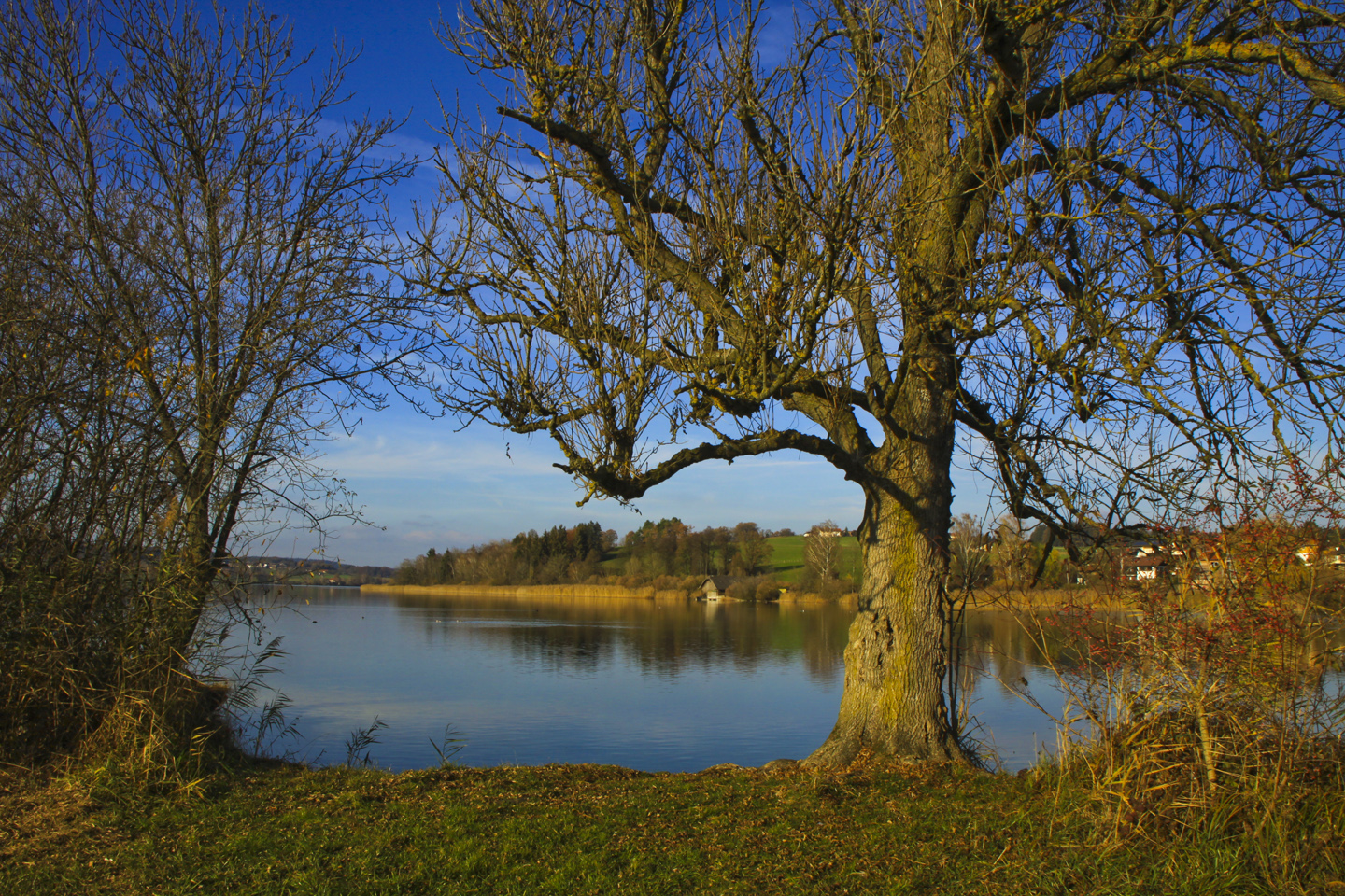 Dann geht es aussichtsreich bis zur weißen Kapelle am Ortsanfang von Aufham, dort halten wir uns scharf rechts und wandern auf dem schmalen Asphaltsträßchen mit tollem Bergblick nach Süden, bis wir beim Gasthaus Sägwirt auf die Vorfahrtsstraße treffen. Auf dem asphaltierten Rad-/Fußweg biegen wir nach links, bei der nächsten Vorfahrtsstraße nach rechts ab und folgen dem straßenbegleitenden Rad-/Fußweg. Rechts taucht der Pelhamer See auf. In Unterulsham überqueren wir die Straße und schwenken scharf rechts ab in einen Naturweg Richtung Wald. Rechts taucht der Pelhamer See auf.