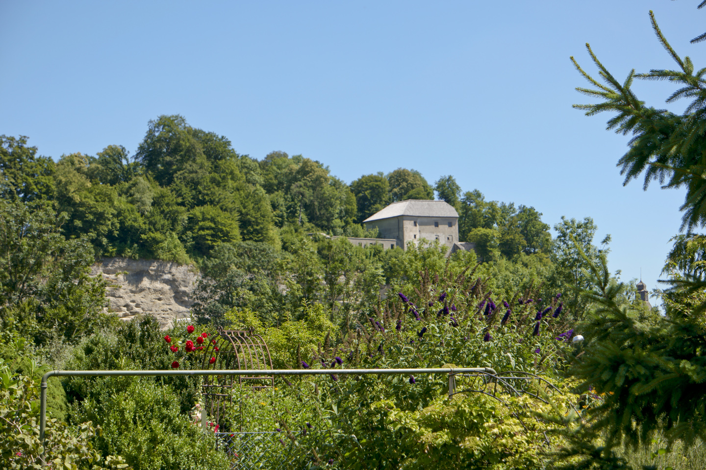 Nach einem Waldstück geht es leicht bergab und in einer großen Rechtskehre über freies Wiesengelände zu den sichtbaren Häusern von Pelham. Beim Hotel Seeblick können wir einen herrlichen Ausblick über den Pelhamer See genießen und auch einen kurzen Abstecher zum interessanten Hochseilgarten machen, der nur wenige Meter oberhalb des Hotels liegt.