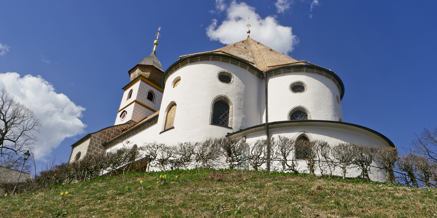 Unser Weiterweg führt vor dem Hotel scharf links zwischen den Häusern hindurch auf einem nicht asphaltierten Weg leicht bergan und bringt uns über eine aussichtsreiche Kuppe in einer Links-Rechts-Kehre zu einer Verzweigung am Waldrand. Wir biegen links ab, wandern in den lichten Wald hinein und folgen dem schnurgeraden Weg. Nach einer scharfen Rechtskehre erreichen wir den Ort Zunham, durchqueren ihn und folgen rechts dem Rad-/Fußweg neben der Endorfer Straße. Kurz darauf überqueren wir die Vorfahrtsstraße und steigen die letzten Meter neben der Straße Weingarten hoch zu unserem Ausgangspunkt, der weithin sichtbaren Kirche von Höslwang.